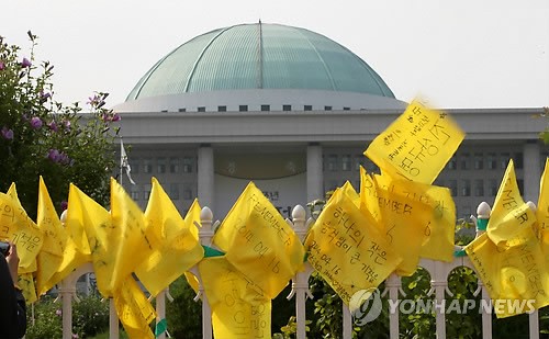 16일 오후 서울 여의도 국회 정문에 세월호 침몰사고에서 생존한 안산 단원고 2학년 학생들이 학교에서부터 국회까지 1박 2일간의 도보행진을 마치며 꽂아둔 노란 깃발 'REMEMBER(리멤버) 2014.04.16', '잊지않을께 사랑해' 등이 바람에 날리고 있다. 2014.7.16