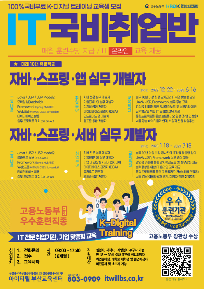 ★ 우수훈련기관 아이티윌부산 "IT국비취업반" 훈련생 모집