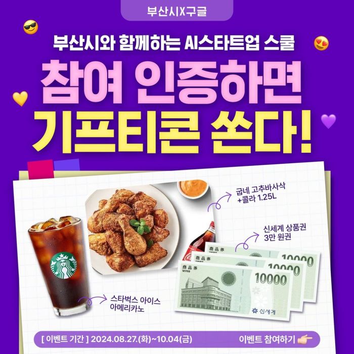 부산시X구글 AI스타트업 스쿨 참여 인증 이벤트 (스벅, 고추바사삭, 신세계 상품권)