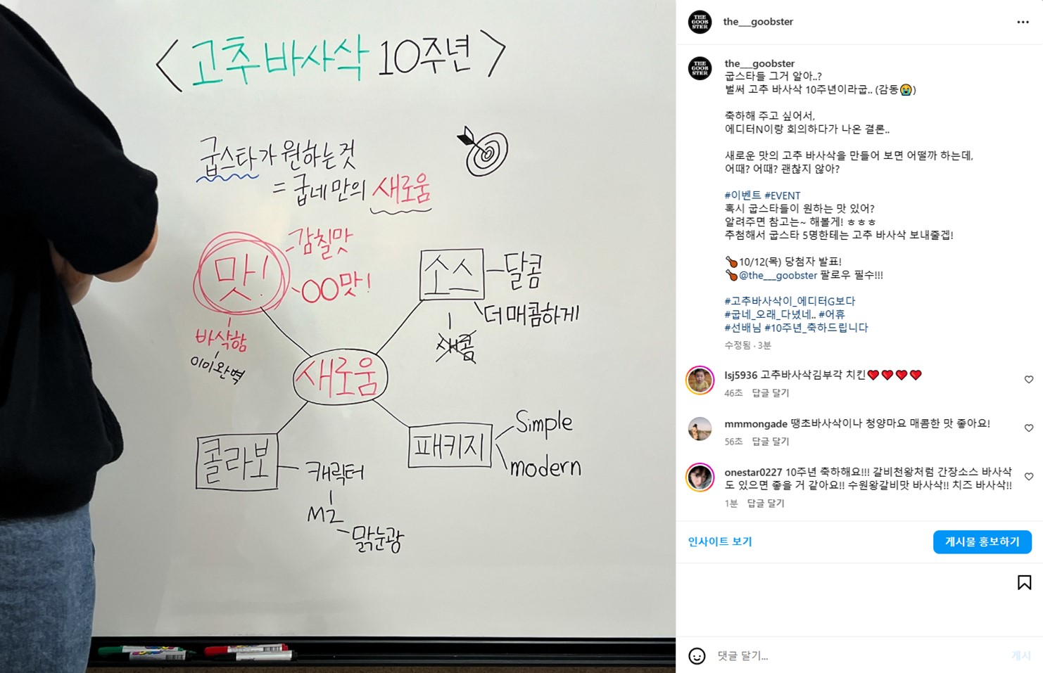#이벤트 #EVENT 혹시 굽스타들이 원하는 맛 있어? 알려주면 참고는~ 해볼게! ㅎㅎㅎ 추첨해서 굽스타 5명한테는 고추 바사삭 보내줄겝! ⠀ 🍗10/12(목) 당첨자 발표! 🍗@the___goobster 팔로우 필수!!!
