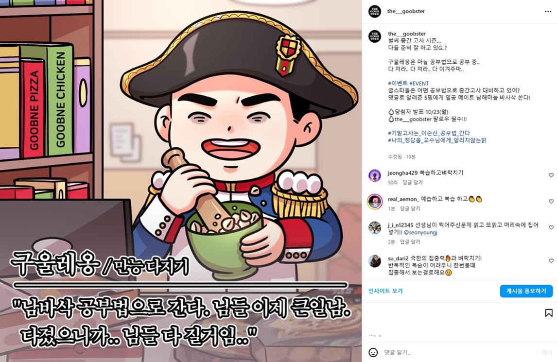 #이벤트 #EVENT 굽스타들은 어떤 공부법으로 중간고사 대비하고 있어? 댓글로 알려준 5명에게 열공 메이트 남해마늘 바사삭 쏜다! ⠀ 🧄당첨자 발표 10/23(월) 🧄the___goobster 팔로우 필수!!!