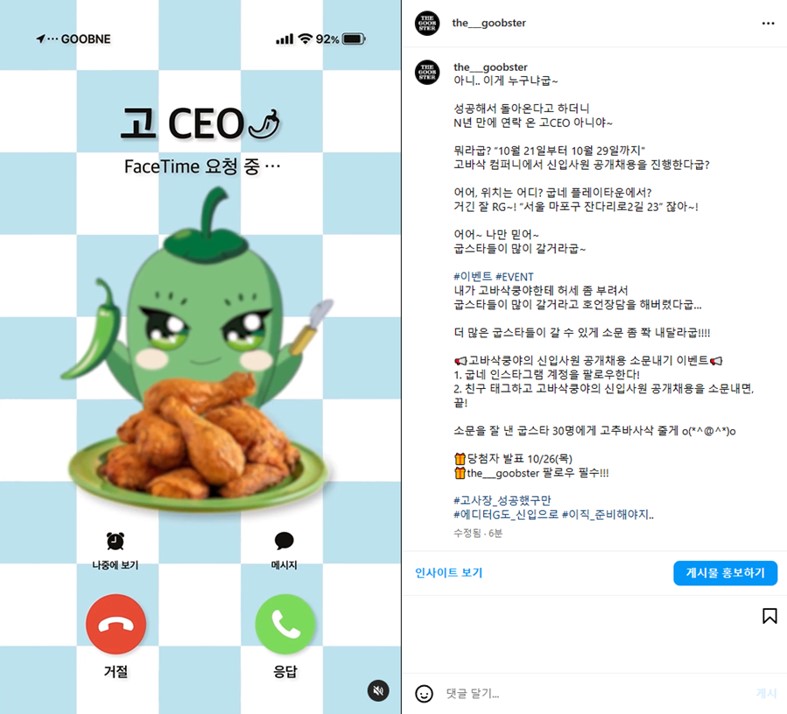 2. 친구 태그하고 고바삭쿵야의 신입사원 공개채용을 소문내면, 끝!