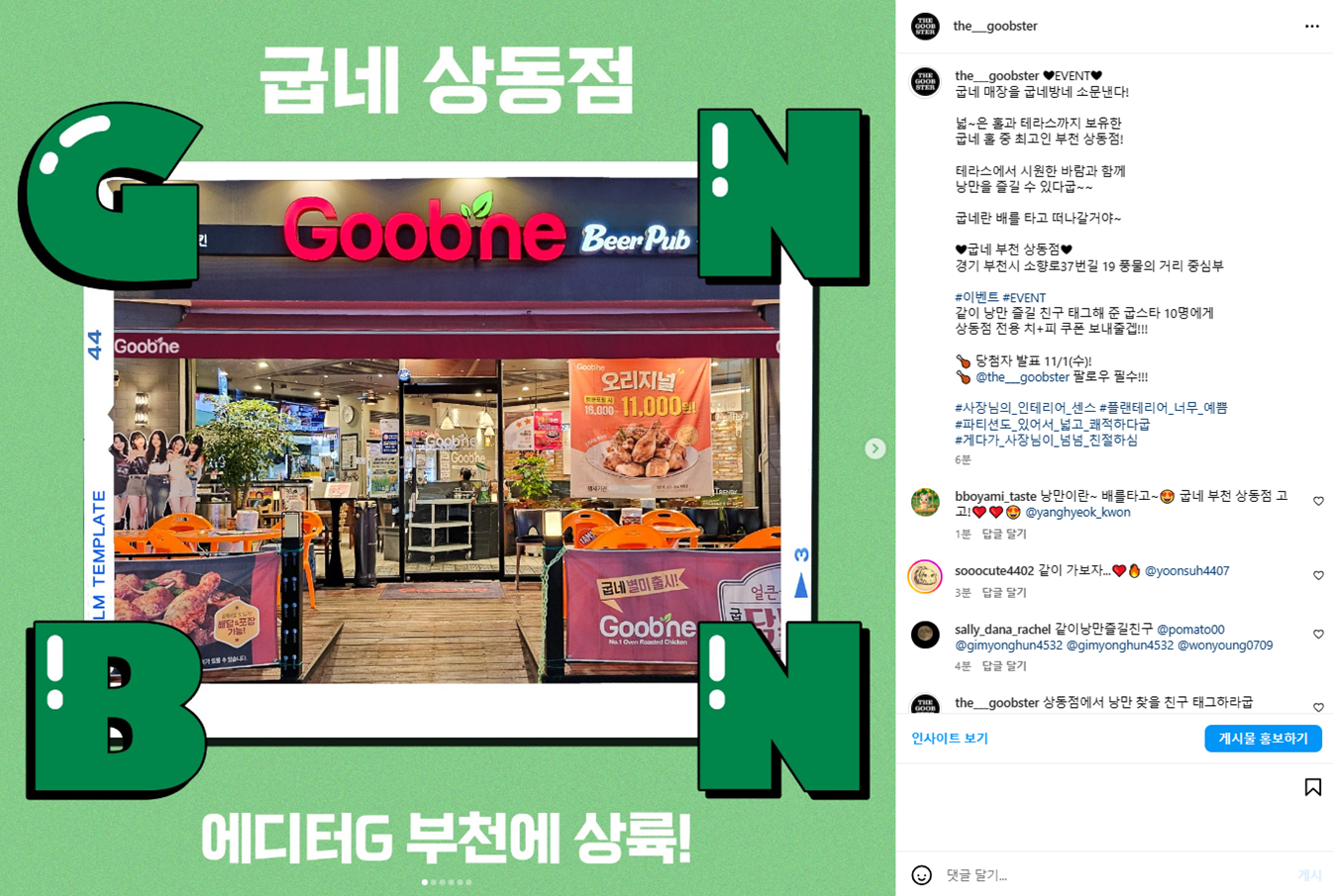 #이벤트 #EVENT 같이 낭만 즐길 친구 태그해 준 굽스타 10명에게 상동점 전용 치+피 쿠폰 보내줄겝!!! ⠀ 🍗 당첨자 발표 11/1(수)! 🍗 @the___goobster 팔로우 필수!!!