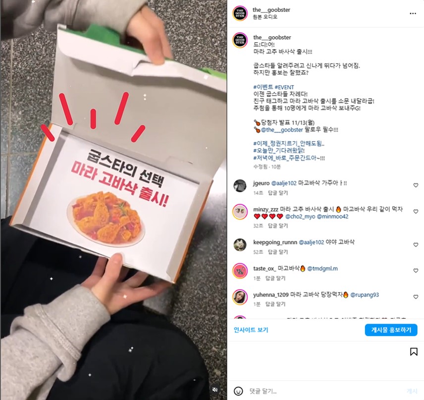 #이벤트 #EVENT 이젠 굽스타들 차례다! 친구 태그하고 마라 고바삭 출시를 소문 내달라굽! 추첨을 통해 10명에게 마라 고바삭 보내주G! ⠀ 🍗당첨자 발표 11/13(월) 🍗@the___goobster 팔로우 필수!!!
