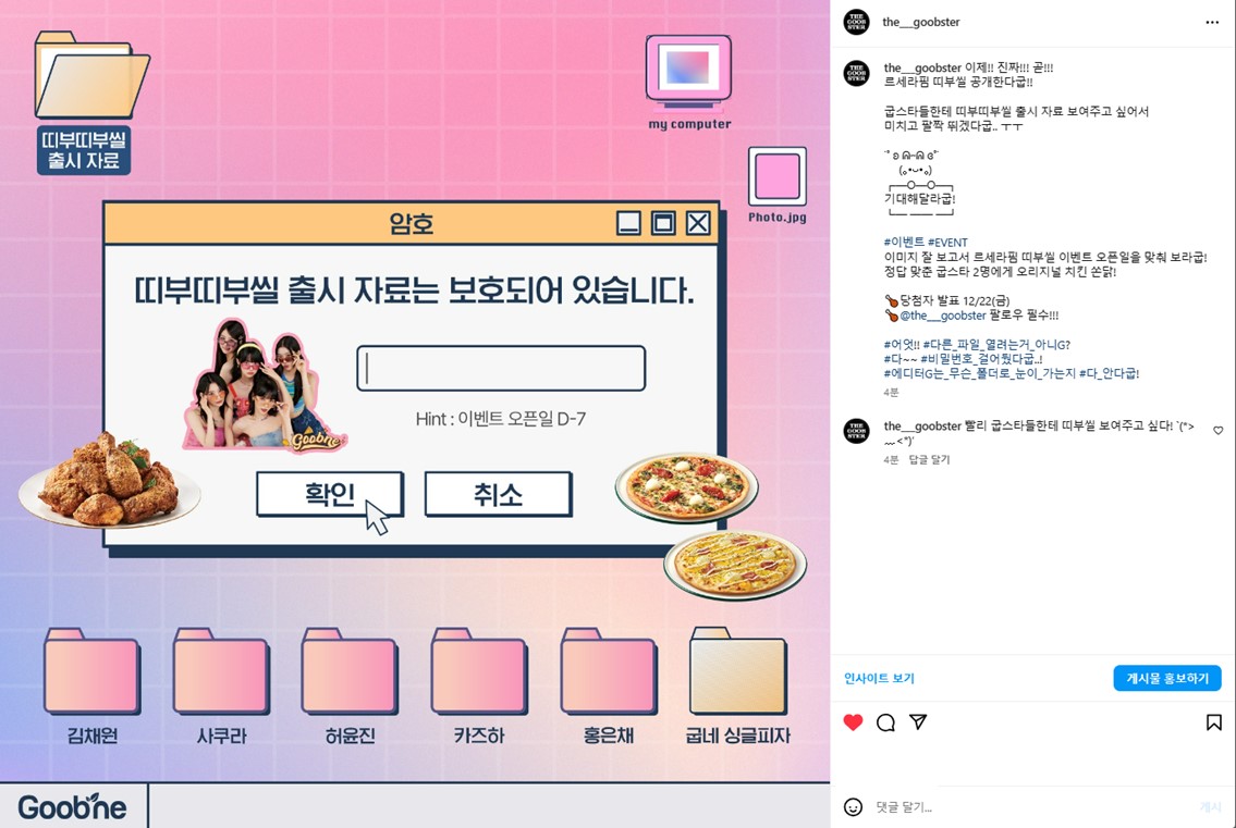 #이벤트 #EVENT 이미지 잘 보고서 르세라핌 띠부씰 이벤트 오픈일을 맞춰 보라굽! 정답 맞춘 굽스타 2명에게 오리지널 치킨 쏜닭!