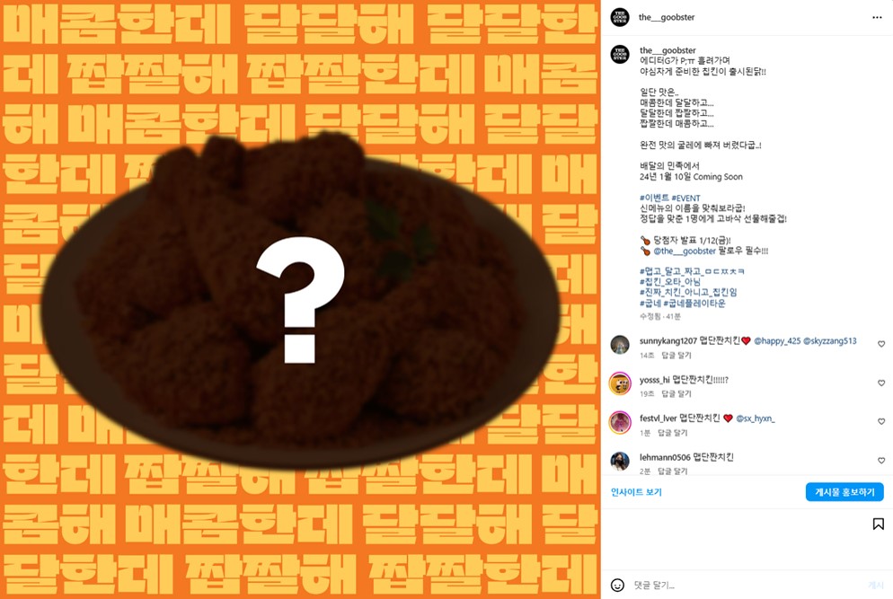 #이벤트 #EVENT 신메뉴의 이름을 맞춰보라굽! 정답을 맞춘 1명에게 고바삭 선물해줄겝! ⠀ 🍗 당첨자 발표 1/12(금)! 🍗 @the___goobster 팔로우 필수!!!