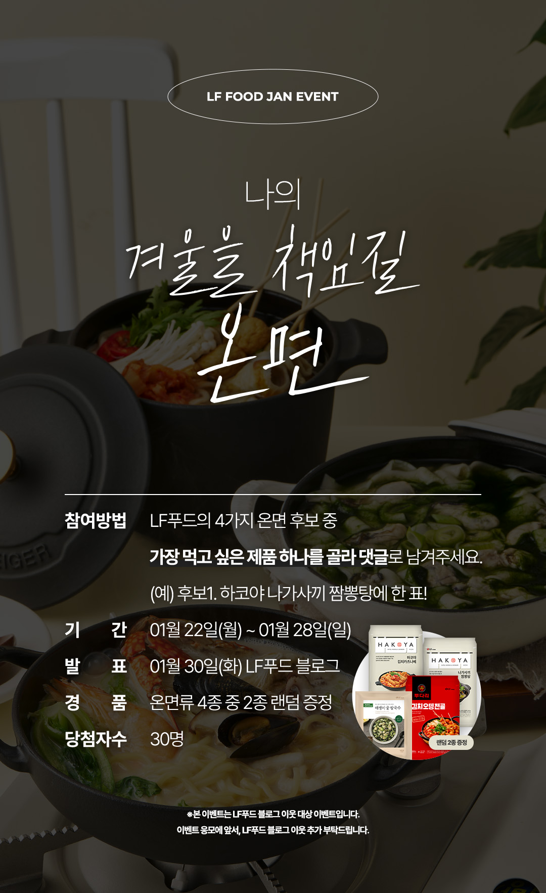 ◾ 참여 방법: LF푸드의 4가지 온면 후보 중 가장 먹고 싶은 제품 하나를 골라 댓글로 남겨주세요.