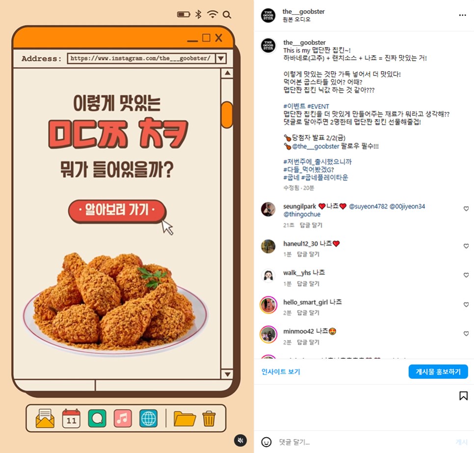 #이벤트 #EVENT 맵단짠 칩킨을 더 맛있게 만들어주는 재료가 뭐라고 생각해?? 댓글로 달아주면 2명한테 맵단짠 칩킨 선물해줄겝! ⠀ 🍗당첨자 발표 2/2(금) 🍗@the___goobster 팔로우 필수!!!