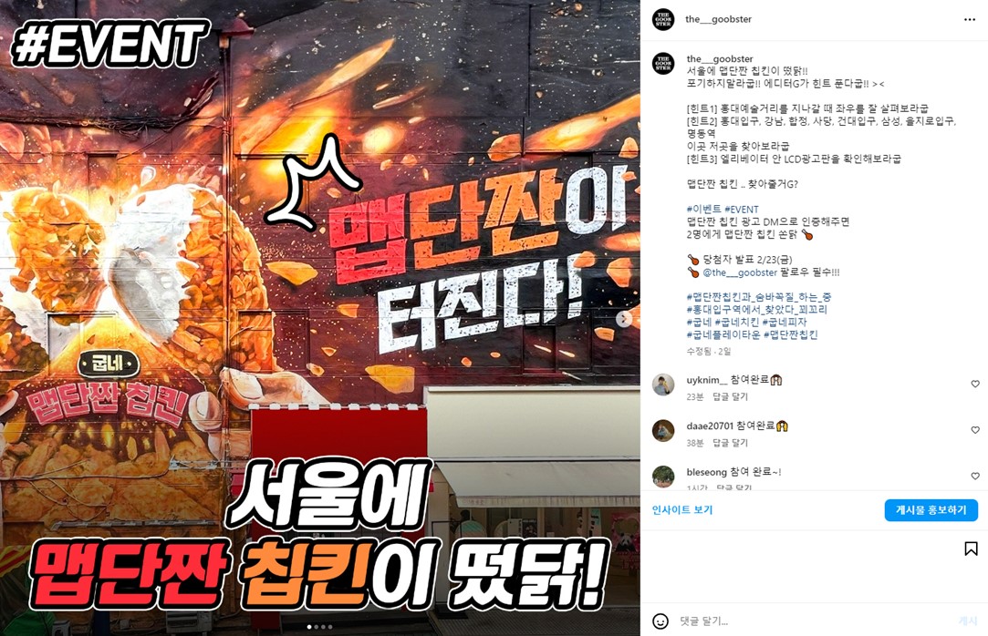 #이벤트 #EVENT 맵단짠 칩킨 광고 DM으로 인증해주면 2명에게 맵단짠 칩킨 쏜닭 🍗 ⠀ 🍗 당첨자 발표 2/23(금) 🍗 @the___goobster 팔로우 필수!!!